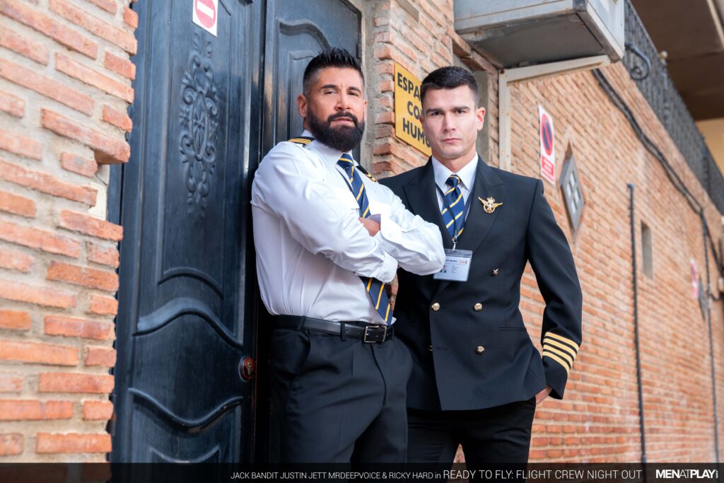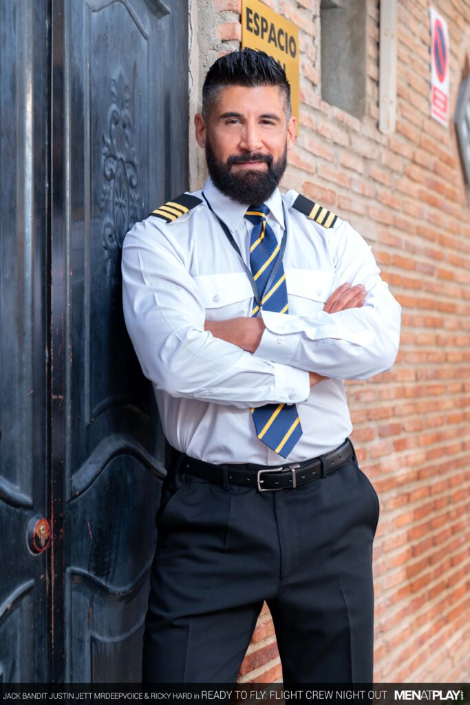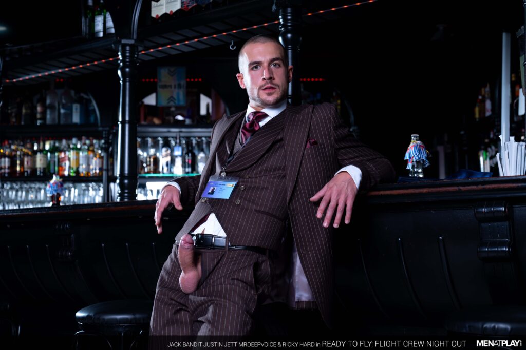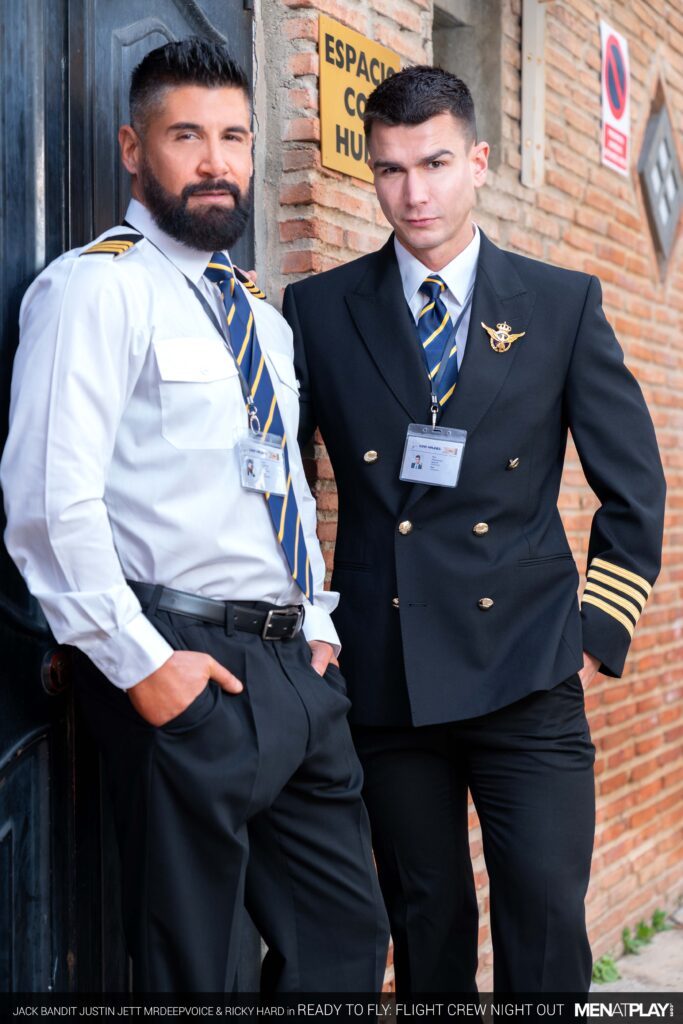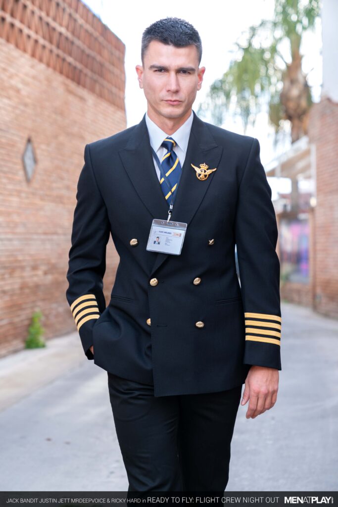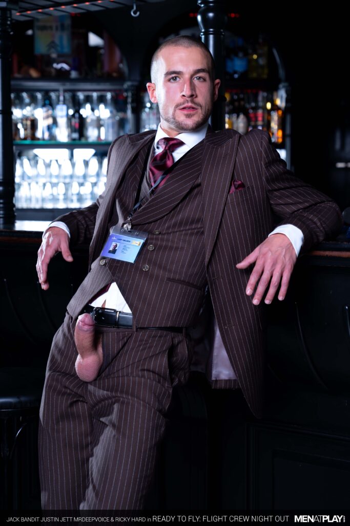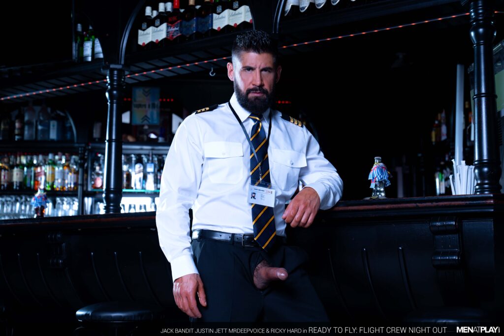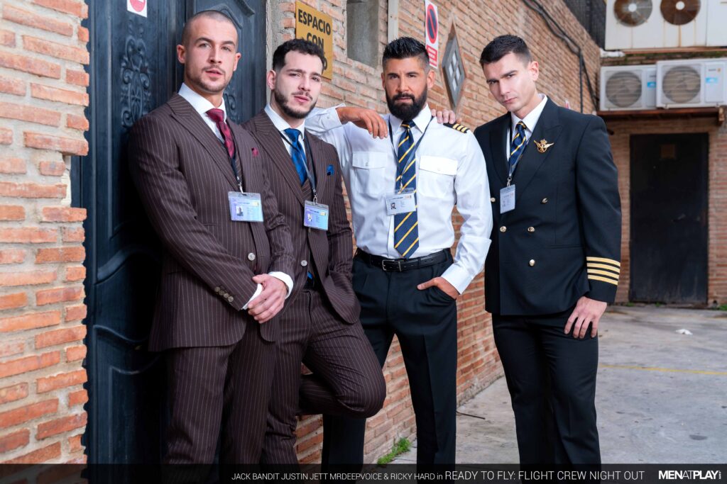 Cabin crew members Jack Bandit and Ricky Hard get on their knees and suck the deck crew, Captain MrDeepVoice, and Pilot Justin Jett through their uniform pant flies. The Captain quickly loosens up and is soon sucking on Ricky’s cock before sitting him on top of the bar and sharing the Portuguese cock with Justin while Jack sucks him next. Feeling adventurous, the Captain allows Jack to eat and finger his British ass while Justin rims Ricky.