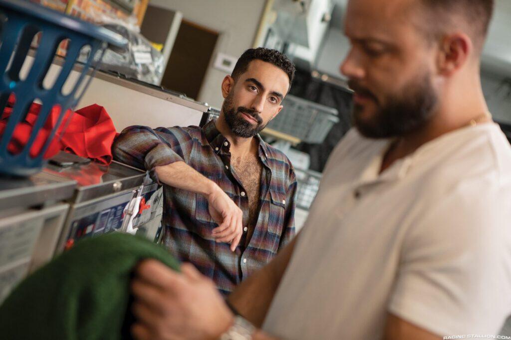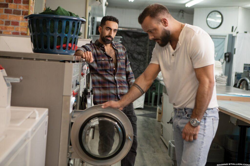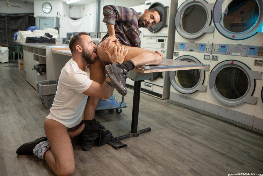 “It’s Sir Peter’s first time at this laundromat, and horny local Ali Rush is making sure to welcome the hung hunk with an open mouth and an open hole. After swallowing as much of Sir Peter’s massive meat as his jaw will allow, Ali bends over a folding station so his new friend can rim and bareback his hairy hole. Still going hard in the middle of the laundromat, Sir Peter pounds every inch of his big dick into Ali’s eager ass until the satisfied bottom is busting all over his own furry muscles and watching Sir Peter unleash an extra thick load.”