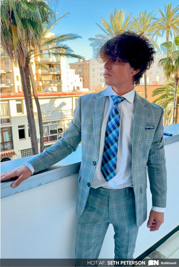 “Seth Peterson comes back to the hotel after a long night out on the town. A quick look out the window to take in the beautiful coast of southern Spain, and he admires last night’s outfit. A blue plaid suit, a white shirt, fine leather shoes, and a cowboy belt lend a bit of personality to his otherwise all-business look.