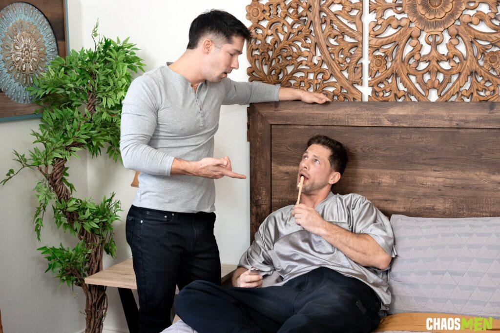 Roman Todd and Eddie B are bros who work hard and play better. The cocksucking between the two gets intense and Roman Todd gets face fucked by the hard cock of Eddie B. Eddie B loves feeding his hard cock and getting is sucked good. Eddie B loves the intense cocksucking in the bedroom and will do anything that Eddie B does with his cock in Roman’s mouth. After a quick 69, Roman Todd gets on top to get his tight hole fucked deeply. They fuck hard after until Roman Todd is the first to cum with stroking his hard cock. Eddie B finishes with his load over Roman’s face and body. These two are bros and at Chaos Men they show they fuck hard too.