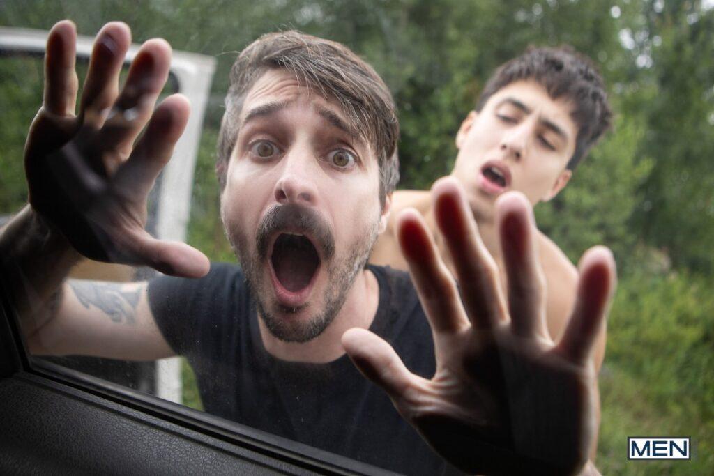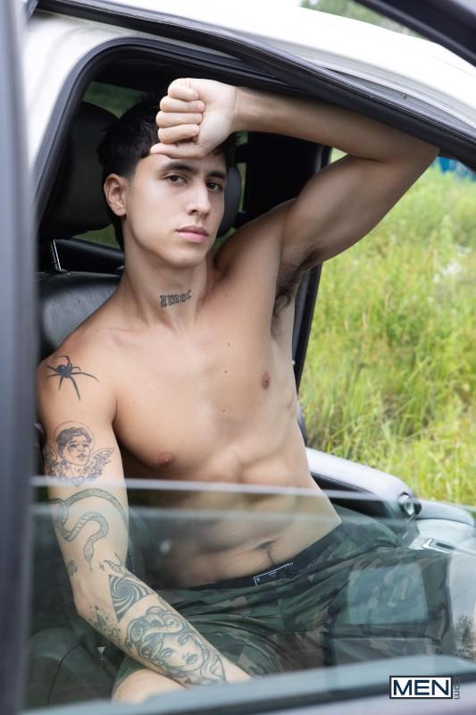 “Just two straight dudes on a road trip chatting about how much they love decks, till Angel Elias needs a rest stop and can’t wait for the next exit, grabbing an empty bottle. Driver Seb Leblan keeps looking at his buddy’s uncut dick, and pulls over so he can suck it! Seb gets out and takes out his own uncut cock, and the guys dock before Angel puts Seb against the side of the truck, licking his hole and then fucking him. Seb rides the top and takes the uncut dick in doggystyle and missionary till he cums, then Angel shoots in his mouth.”