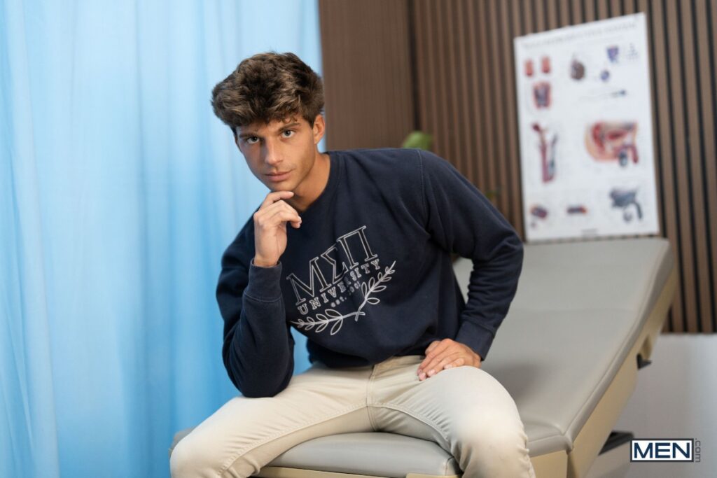 Oliver Marks gets bored waiting at the college health center and starts playing with the stethoscope and even trying on the white coat. That’s why, when Leo Levine’s friend wheels him in with an urgent, throbbing problem, they think he’s the doctor! Oliver tells them he’s not a medical man, but he knows enough to diagnose Leo with a textbook case of blue balls. He sucks the hot twink, then drills him from behind, and Oliver rides Leo in the wheelchair. The bottom takes his turn on the exam table as Leo fucks him in missionary till he orgasms, and Leo finally drains his balls!
