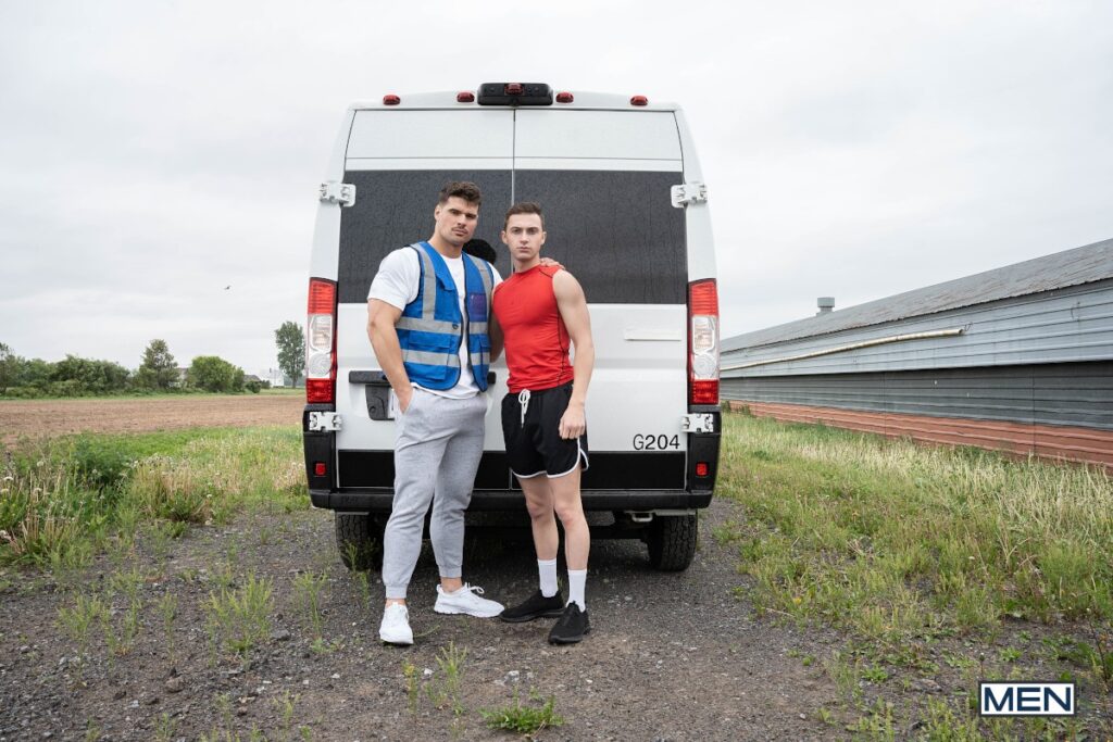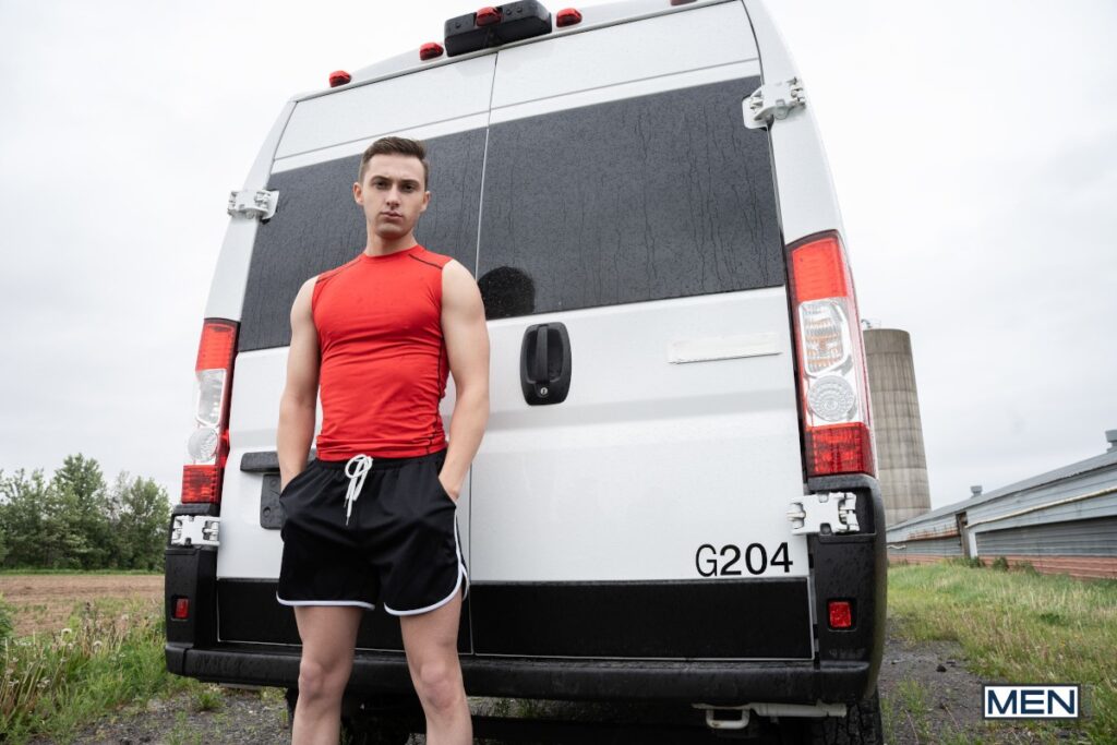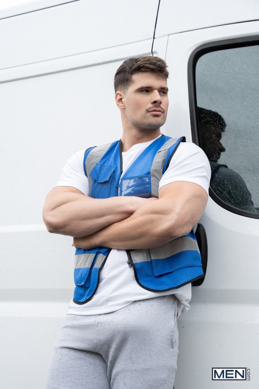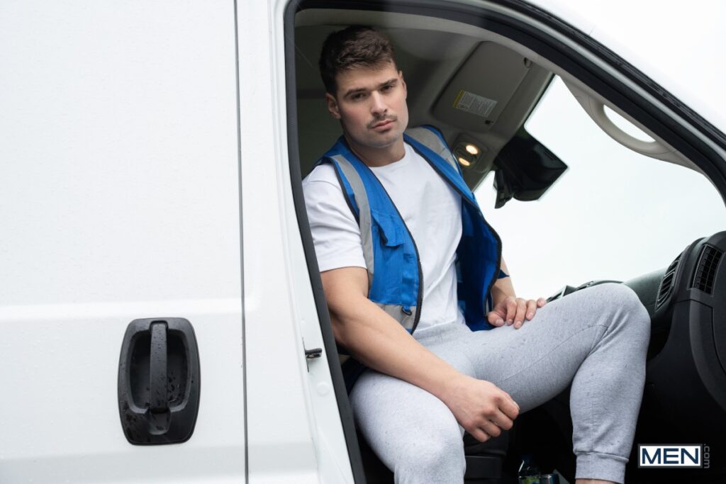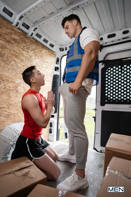 Christopher White is out for a walk when he sees hot delivery driver Malik Delgaty pull up and finds himself face to face with the mustached top and his big package! Christopher stows away in the van, and when he’s discovered he begs the straight driver for a look at his cock. Malik takes it out and lets the eager bottom suck him, then pushes Christopher up against the wall and slides that big dick in his hole. He fucks the bottom while Christopher hangs off the side of the van, drills him on a box on his back till Christopher cums, then shoots in his mouth.