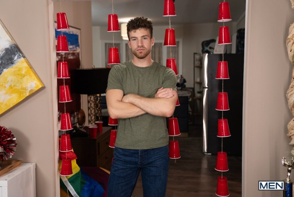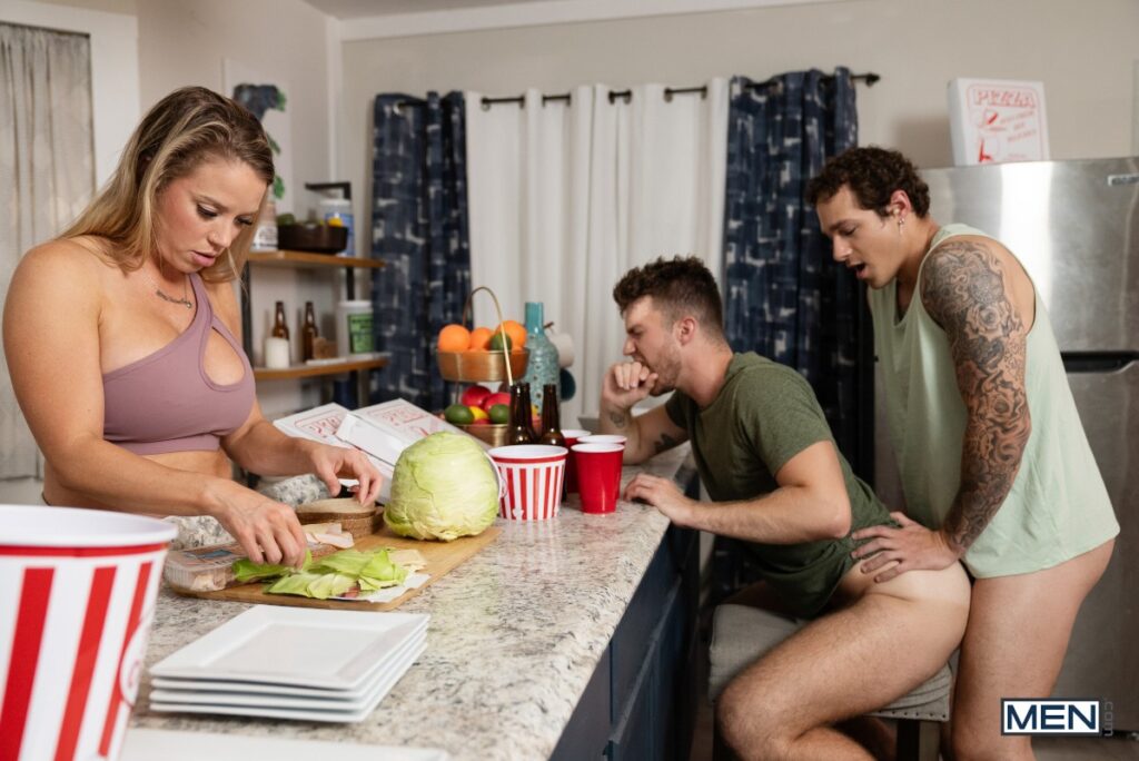 Jayden Marcos’s girlfriend isn’t a huge fan of how his roommates are always cockblocking them during their dates in the frat house. A wrong move leads to the right one as frat bro Carter Collins reaches for the popcorn and puts his hand right on Jayden’s bulge! Jayden’s not mad; he takes out his cock and Carter sucks it while the GF is in the other room. The top sneakily fucks Carter from behind in the kitchen, not even stopping when his girl catches them and storms out. He pounds the bottom on the floor, and Carter rides Jayden on the couch, then cums as the top drills him on his back. Jayden pulls out and blows his load!