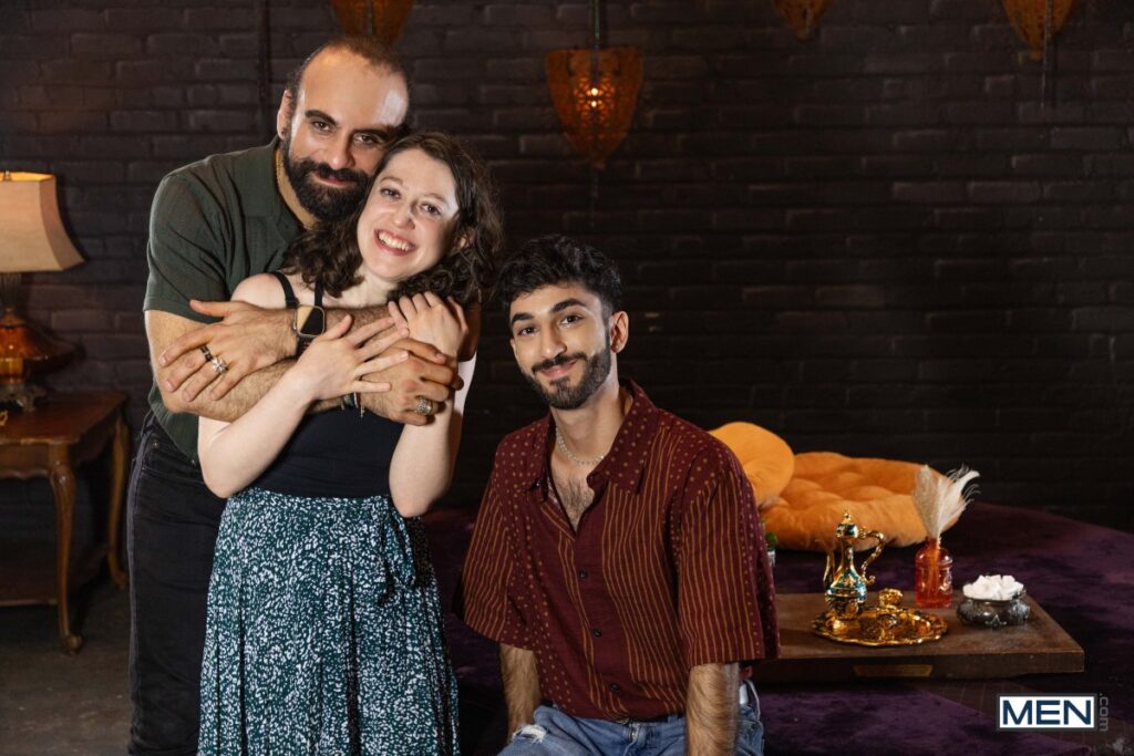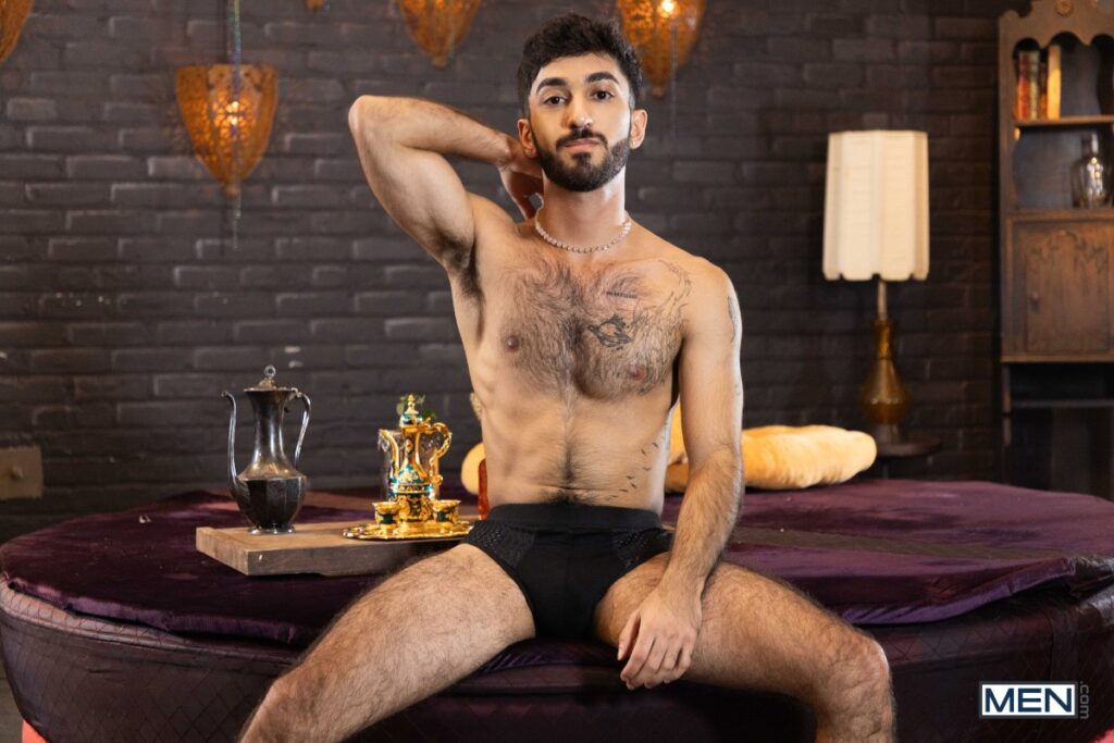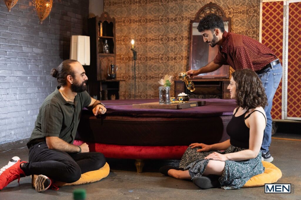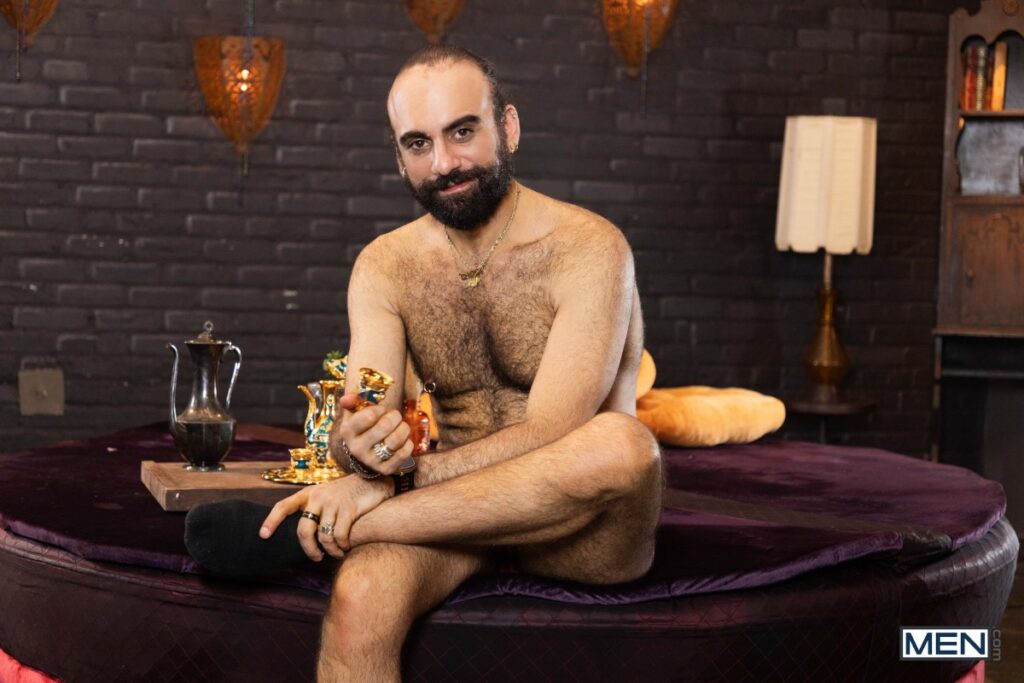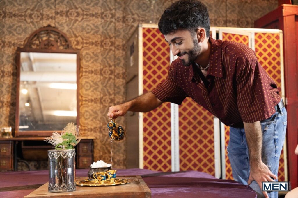 Elio Knight’s girlfriend orders a PSL, but this isn’t that kind of tea shop. Waiter Ari Yummey flirts with the hairy top, then flashes his ass, making Elio do a spit-take… all over his GF! While she’s in the bathroom, the waiter sucks his hot customer, and the hairy guys 69, then fuck doggystyle. Elio raws the bottom on his back, then Ari rides him before sucking the pierced top and taking a facial.