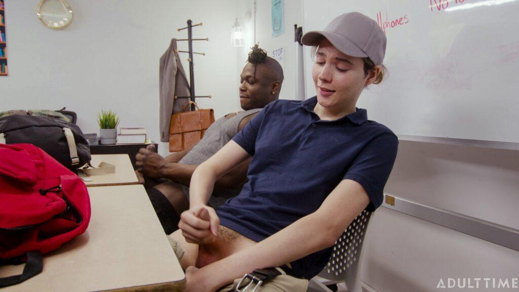 As the bored students chat, they agree that detention sucks even more now that they can’t even look at their hot teacher anymore… but that leads to them coming up with excuses to jerk off right there in the classroom. Eventually, they come up with excuses to go even further with each other!