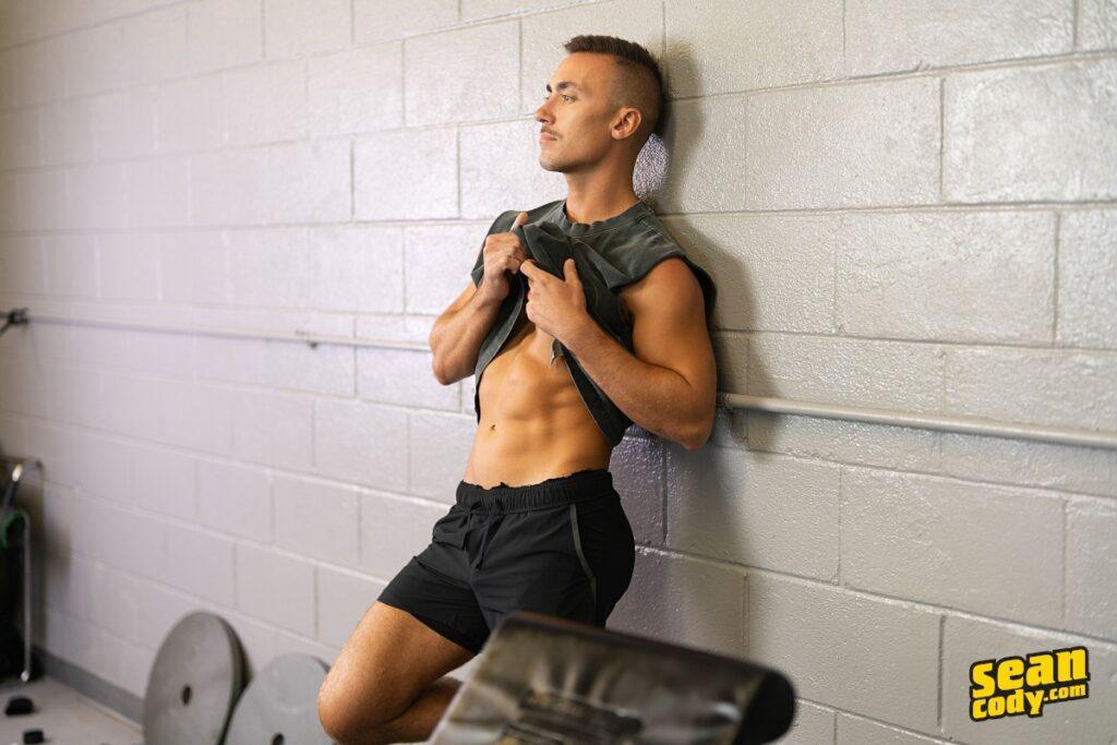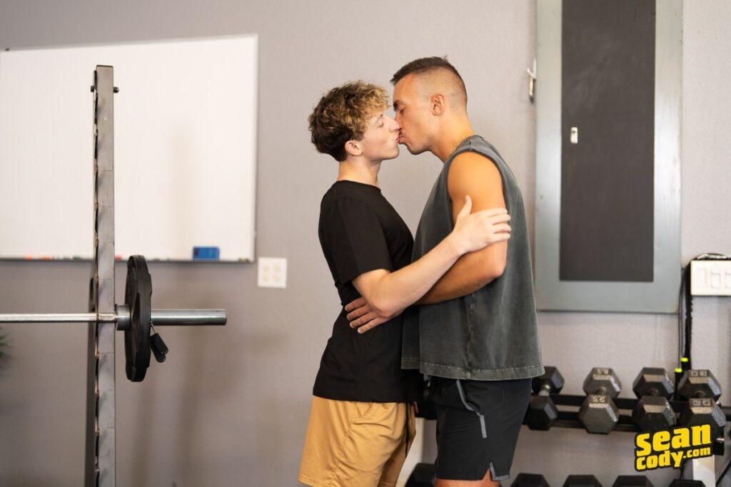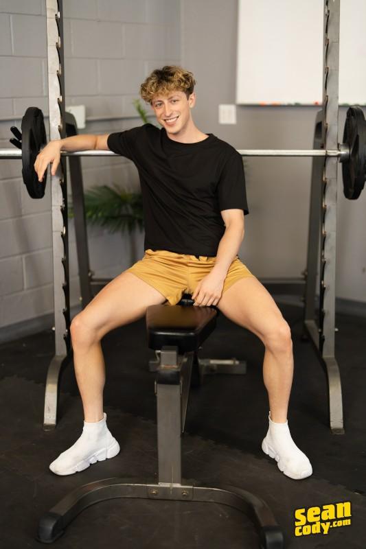 As Joey spots his bench press, Danny says, “It’s hot in here, let’s take our shirts off.” The curly-haired twink gets in one more set, and Joey gives him some form tips before Danny sucks his cock. Joey gets the bottom on all fours to lick his hole, then flips him over and penetrates him. Danny rides the mustached top on the floor, then takes that dick against the wall till he orgasms before Joey cums in his mouth.