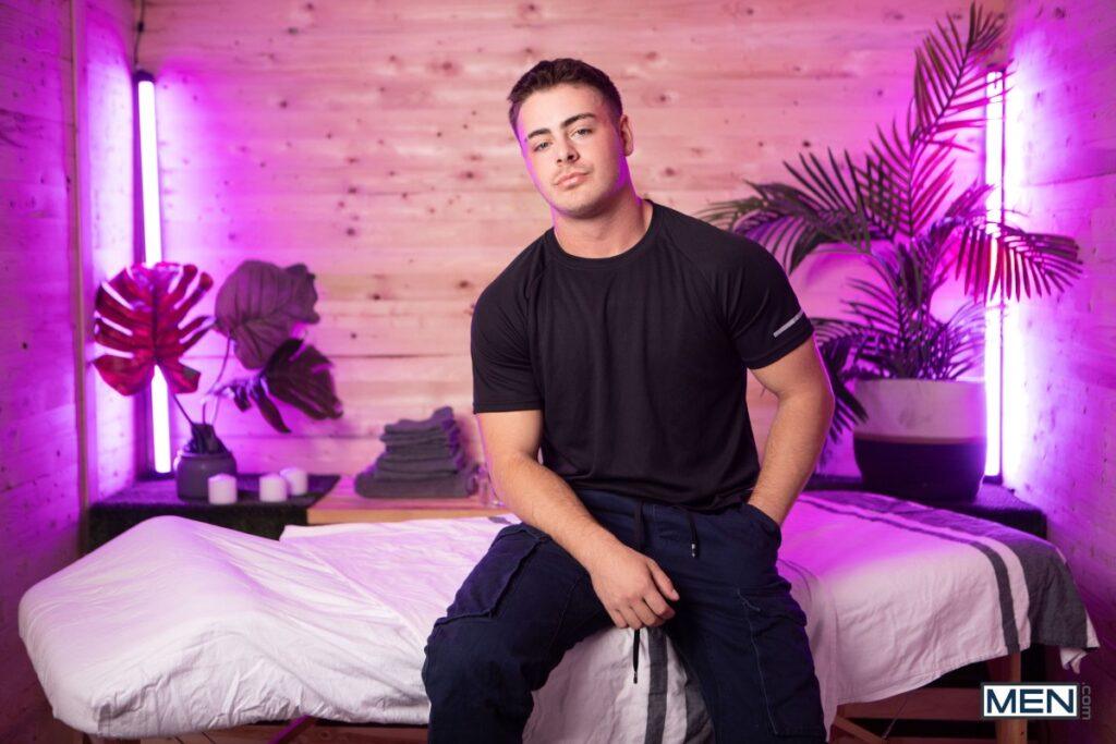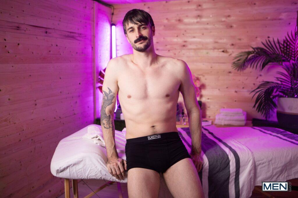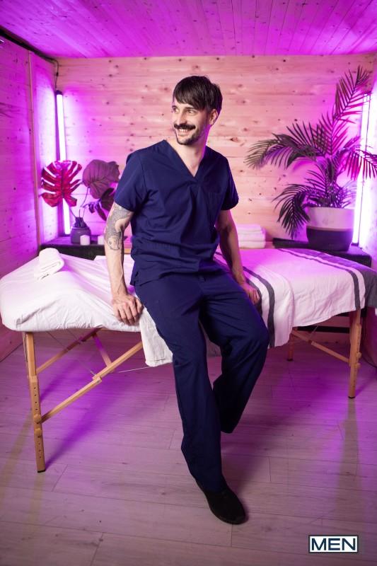 Massage clinic receptionist Seb Leblan tries to tell Cole Black that they only offer legit massages, but Cole just doesn’t get it, and sure enough, he shows the massage therapist his boner and asks for a happy ending. The grossed-out masseuse covers the client’s eyes and goes to get Seb to share a laugh, but when she leaves, Seb decides to give the client what he wants. Cole is surprised to find a guy sucking him, but tells Seb to keep going, and eventually he takes Seb up on his offer to fuck him! After Seb rides him, Cole pounds Seb on the table till the bottom orgasms, then cums in his mouth.