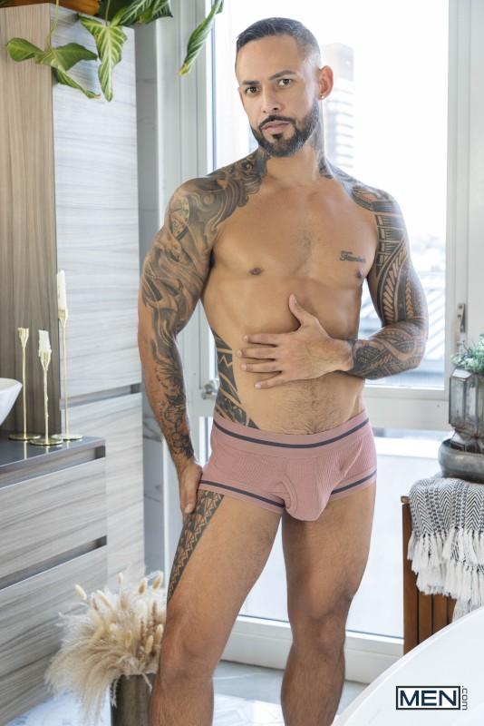 You’ve waited long enough: Diego Sans is back! The hunk runs himself a bubble bath and strips out of his robe for a nice, relaxing soak. He’s joined by Jona Ortiz, who bends down to suck his huge cock. Diego uses the tattooed bottom’s mouth before bending him over to finger his hole, then fucking him against the wall. Jona rides the top on a couch and takes that dick face down, ass up before Diego drills him as he hangs from a railing. The guys finish off Diego’s triumphant return by swapping facials.