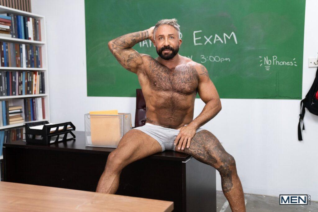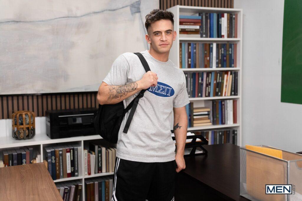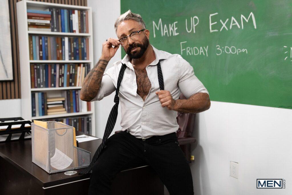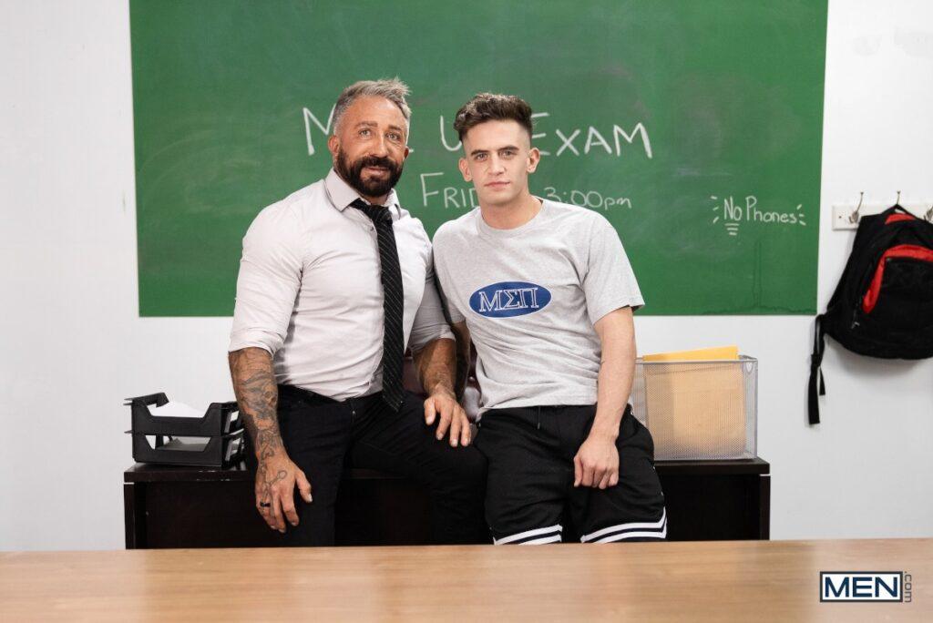 College guy Trevor Brooks has the classroom to himself when he arrives for the makeup exam, so why not have a little quality time? Professor Ken Rock catches him with his phone in one hand and his boner in the other, and quickly confiscates the electronic device. Troye Dean sits next to Trevor, and the guys flirt. Then Trevor pulls a dildo out of his bookbag to fuck himself, and Troye starts filming! Troye makes a hasty exit when the professor catches them, but Professor Rock takes control of the dildo, pumping it in the student’s ass before Trevor sucks the silver fox. The tattooed teacher drills Trevor from behind, then sits in his chair as the bottom rides his dick. Trevor cums as his professor fucks him on the desk, then gets on his knees for a facial.