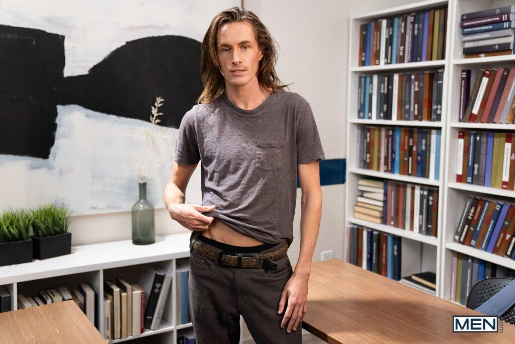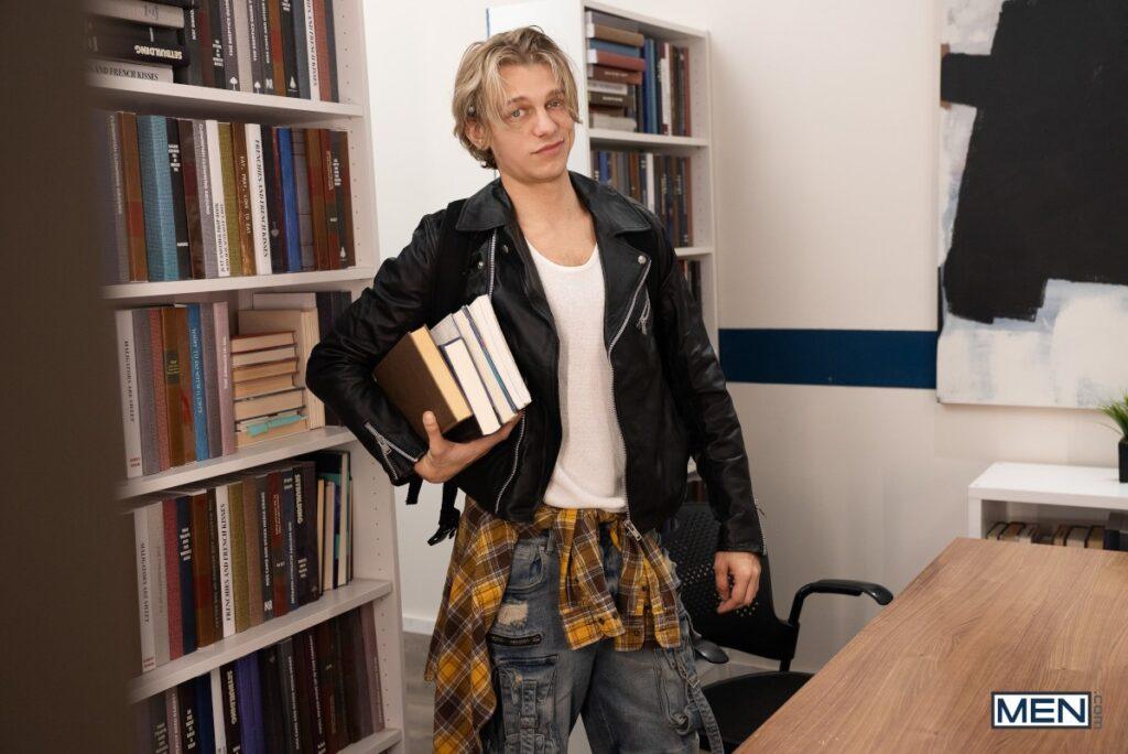 Sawyer Dixon is studying quietly in the library when campus bad boy Leo Louis comes in and thumps his books down on the table. After Leo flirtily takes off his leather jacket, Sawyer matches him, and soon the guys are both shirtless. Sawyer can’t believe his eyes when Leo pulls out his huge boner and slaps it down, and he comes over to stroke and suck it. Leo rims the bottom and drills him on the table, then fucks Sawyer’s mouth as he works a toy in his hole. Leo returns to fucking the long-haired hunk on his back till Sawyer cums, then pulls out to empty his balls.