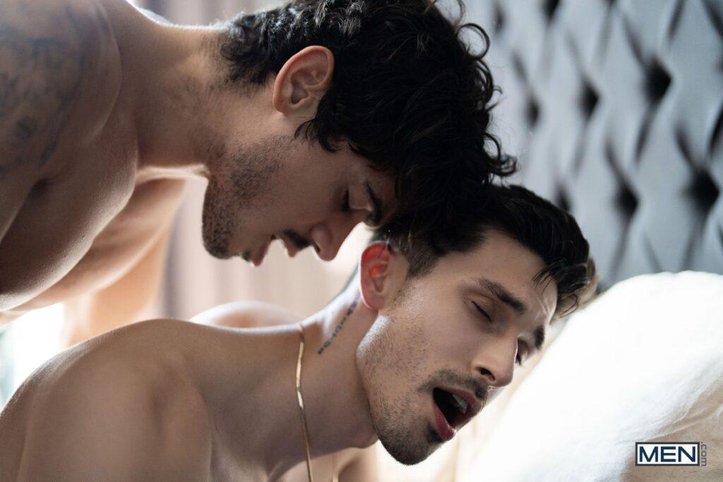 Ashton Summers is passing the open bedroom door when he notices Kane Fox stretched out on the bed, naked and in the throes of pleasure as he strokes himself. Kane notices the sexy top watching and beckons him to join him, and the guys kiss before Kane sucks Ashton. Light and shadow play over their bodies as Ashton fucks the bottom against the window frame, then Kane straddles Ashton on the bed, frotting before sitting on the top’s cock. Ashton fucks the horny bottom in doggystyle and on his back until Kane orgasms, then pulls out and cums.