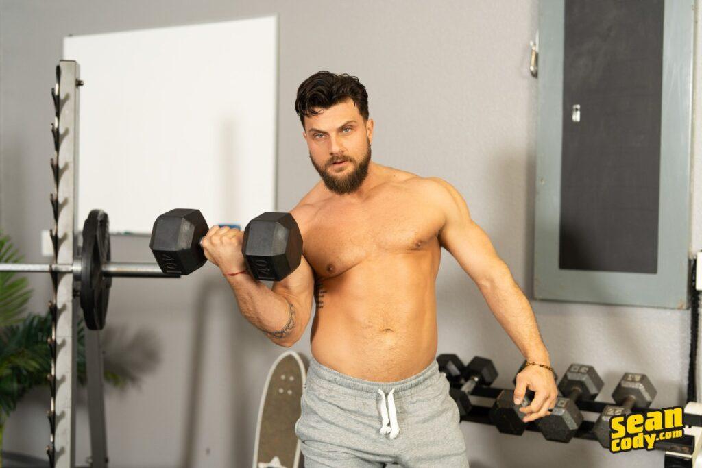 As River’s bent over to stretch, Heath checks out his ass while he jumps rope. The guys start eyeing each other’s muscled bodies, and Heath makes the first move, coming over to kiss the shaven-headed hunk. River gets on his knees to suck the bearded top, and Heath fucks his throat before rimming him and penetrating him from behind. River rides Heath on the floor, then tops him on his back as the guys flip fuck. River fucks the bearded hunk doggystyle till Heath orgasms, then cums on his face.