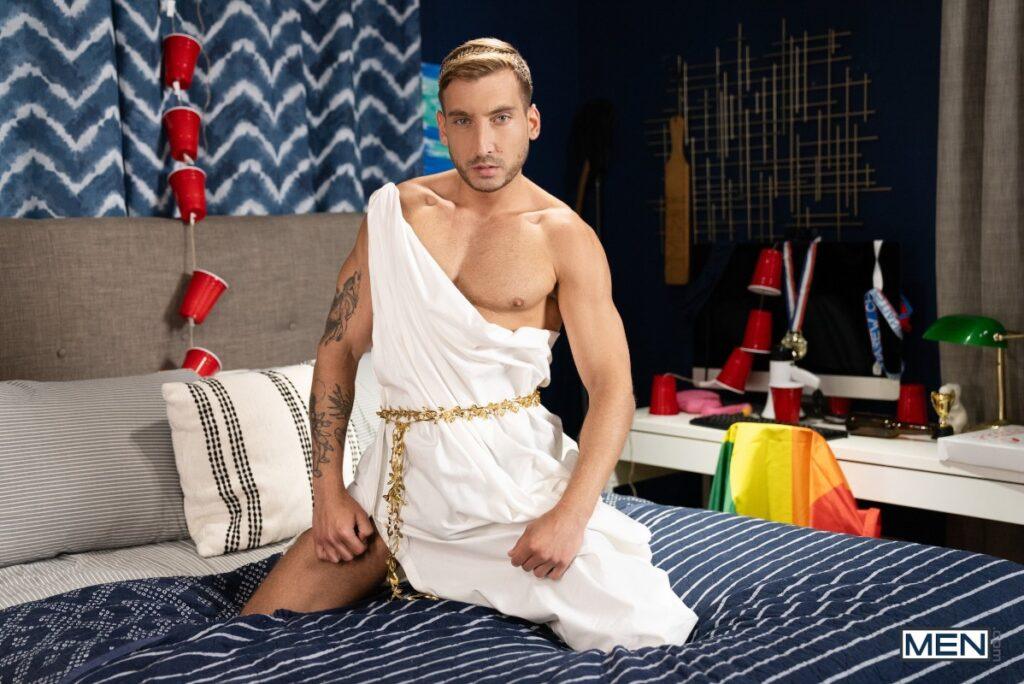College guy Joey Dane is getting ready for the Greek mixer when his hot frat bro Mika Ayden comes into the kitchen with his dick poking out a hole in his toga! Mika asks for a BJ to make sure he’s nice and hard for the party, but stops before he cums. Meanwhile, their housemate Joey Mills is on the floor of his room, face down ass up, after tripping on a dildo, and Mika sees that hole and just has to fuck it! Joey sucks the top, and the guys shed their togas as Mika drills Joey on the bed and bent over his desk. The bottom cums on himself as he gets his hole filled in piledriver, and Mika pulls out and shoots a big load, then pushes it all inside.