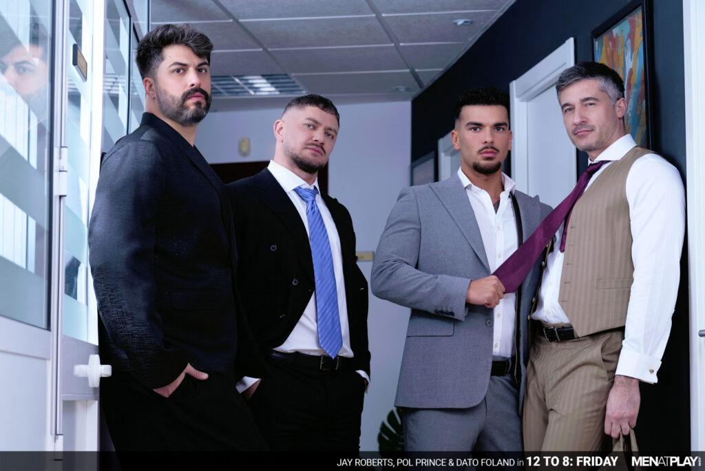 Alvaro invites the studs into the Conference Room while he makes sure that everyone else has made it out. Alone in the room where big decisions are made, they each take a turn sitting at the head of the table, pretending they are the President of the company. When it’s Jay’s turn, he orders Dato and Pol to come and suck his cock! Dato asks Jay if he’s joking, but when he and Pol realize that Jay is serious, they jump at the opportunity to be the first to suck his beautiful 8-inch, uncut, and thick cock in a long time.