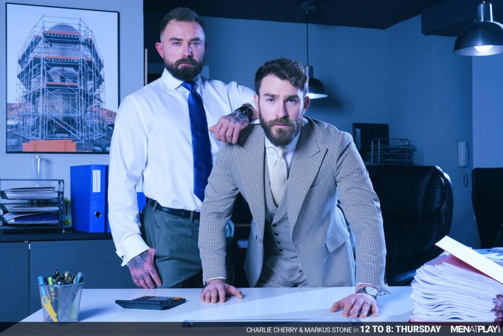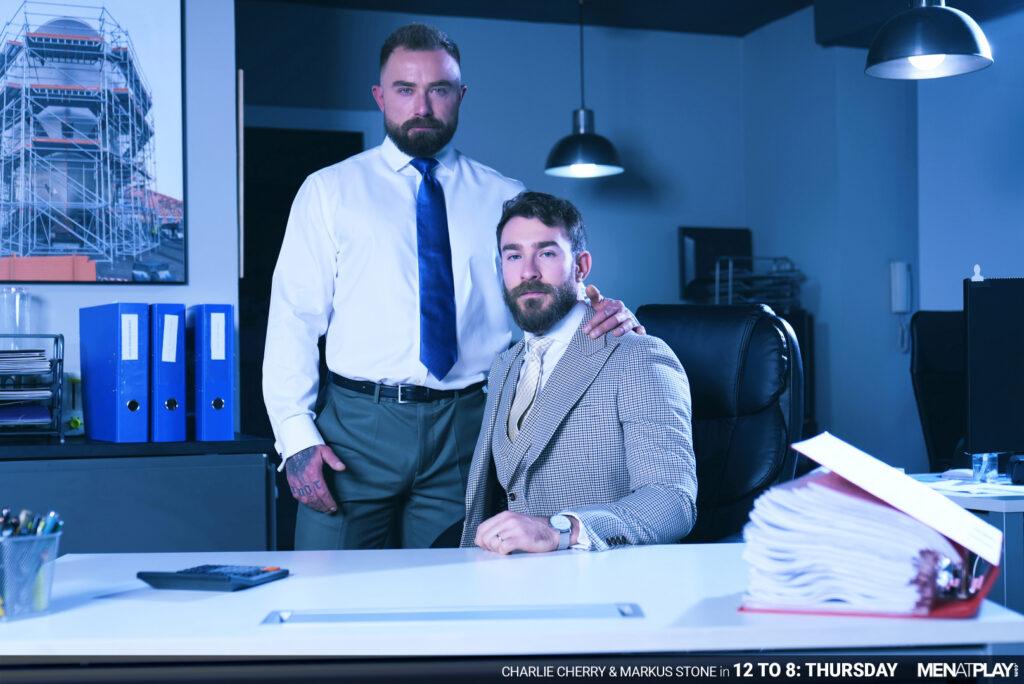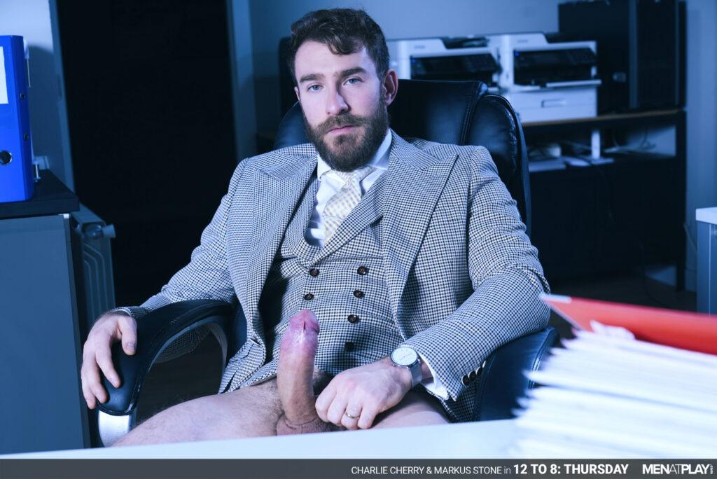 Ready for a dicking, Charlie shoves his XXL cock into Markus and fucks him deep. When he’s ready to release his load, Charlie sits on his chair and jerks the cum out of himself. Markus follows next and cums all over Charlie’s suit to remind him who’s boss.
