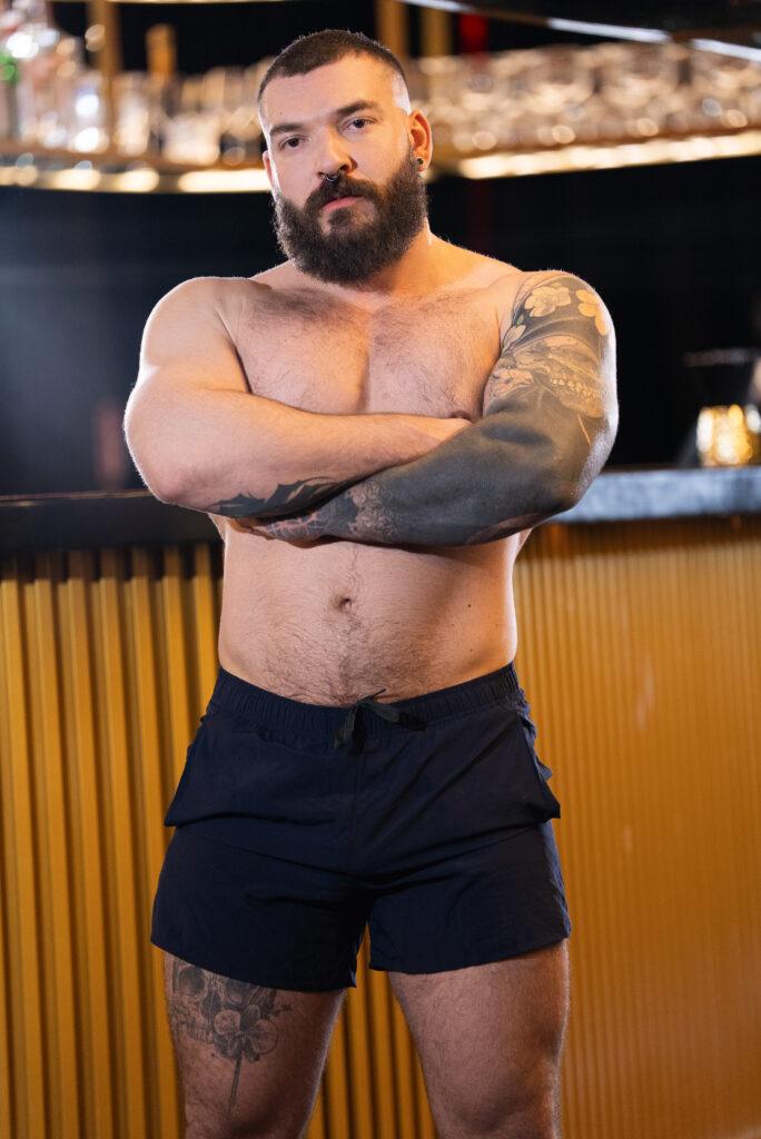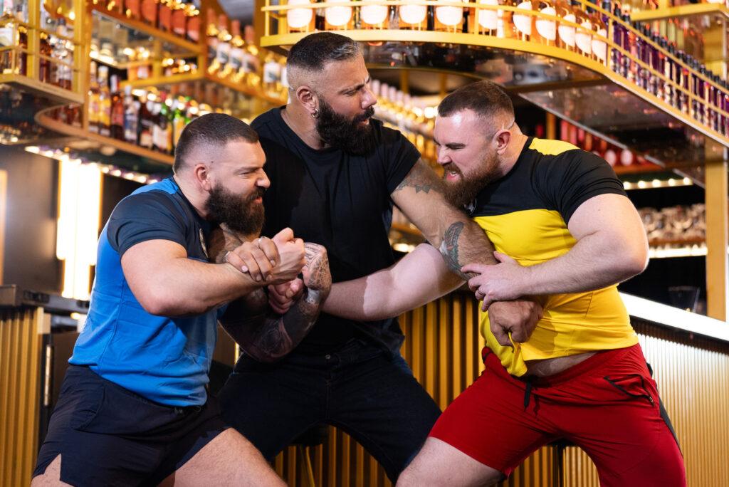 Rival soccer fans Kinkoer and PJ Knox are watching the game at the bar. Despite bartender Alex Marte’s attempts to keep the peace, the burly, bearded bears nearly come to blows! Alex breaks it up and calms things down by jacking both the rowdy guys’ cocks. Kinkoer and PJ spit-roast the bartender, then suck him. It’s Kinkoer’s turn to take the bartender’s dick as he licks his rival’s hole, then PJ gets fucked by the other two before the guys form a train. PJ cums as he rides the others, then Alex and Kinkoer jack off, putting an end to the rivalry… for now!