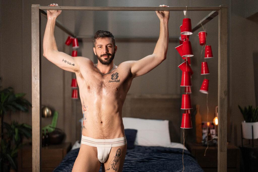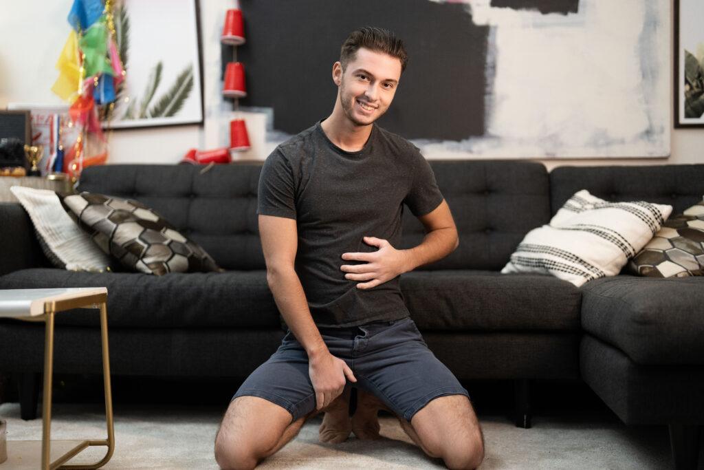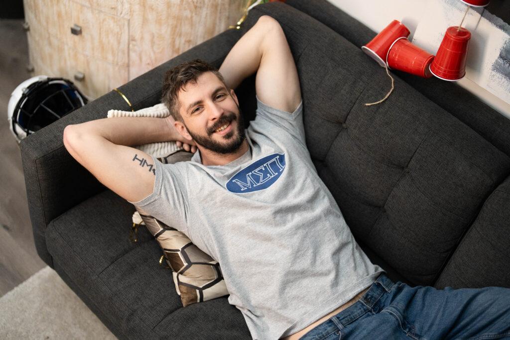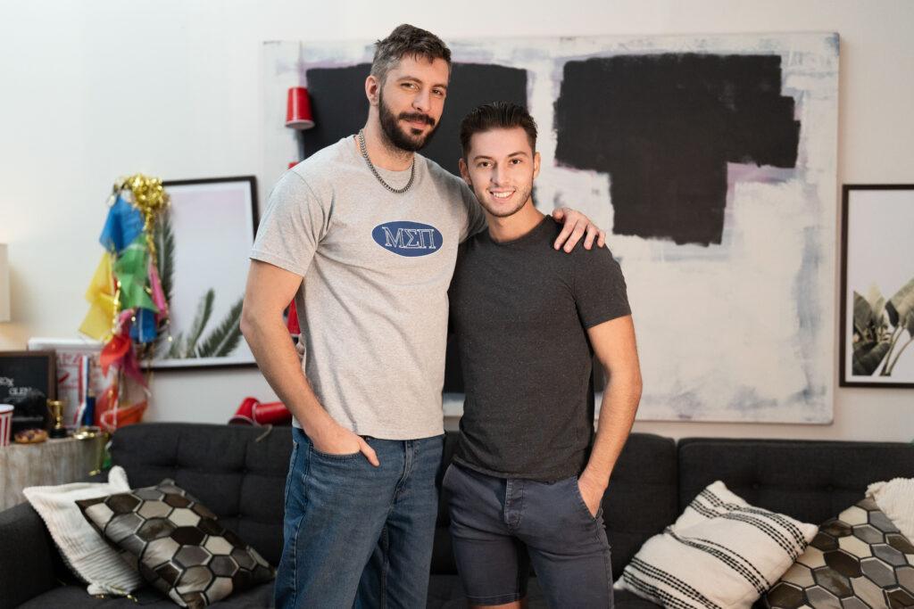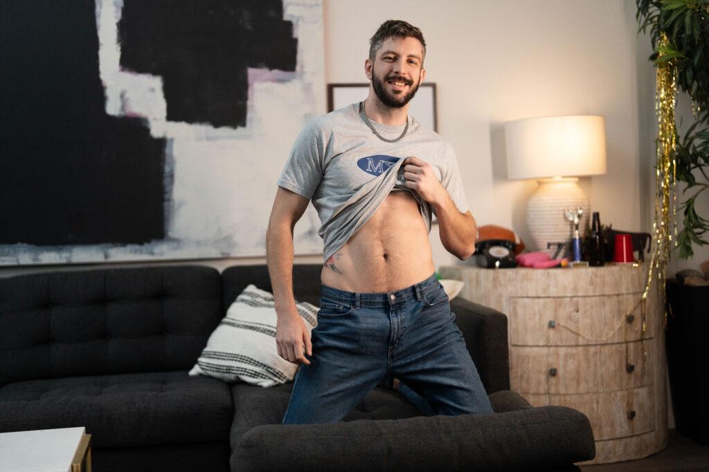 Christopher White walks in on Jake Apton taking some quality time on the couch with his automated stroker and gets turned on, so when Jake leaves the toy unattended while taking a call, Christopher yoinks it to use on himself. Jake walks in and pulls his toy off the top’s cock just as Christopher shoots a massive load that winds up all over him! Jake says he should ask next time if he wants to borrow his sex toys… or his mouth. Christopher fucks the bottom’s face and the guys 69, then the top drills Jake on his back. The bearded hunk can’t get enough as Christopher fucks him doggystyle and in spoon position, then cums as he rides the top. This time Christopher shoots on Jake’s face on purpose!