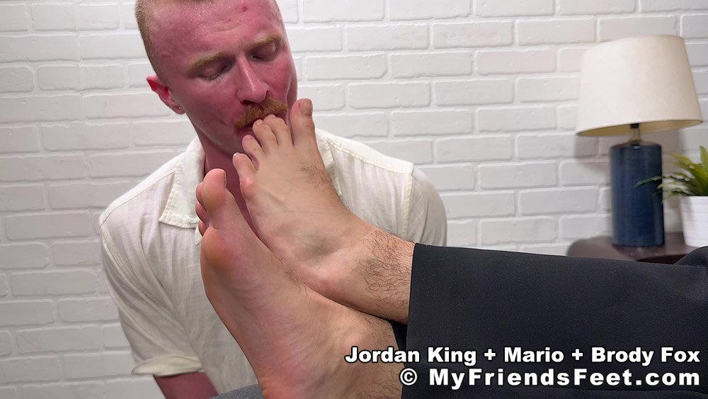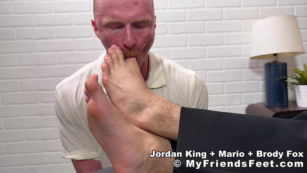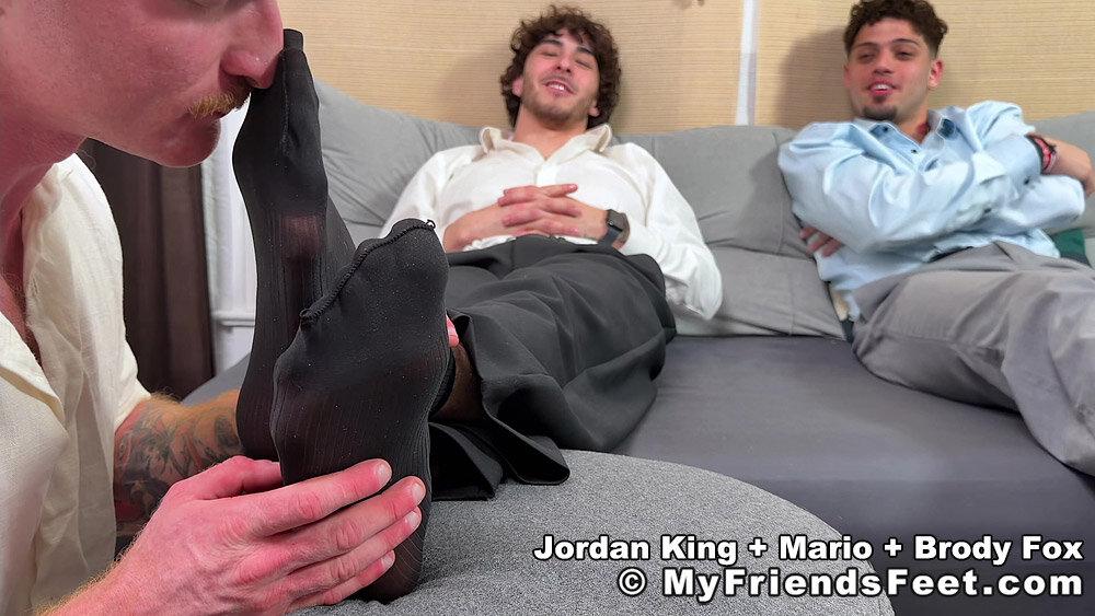 Jordan King couldn’t wait to tell Mario Sanchez about the new guy that moved in! Brody Fox is the strong silent type and a worshiper in training, but he is very eager to make sure Jordan’s feet are taken care of! He slips off Jordan’s shoes revealing his sheer socks and dives right in eventually taking the socks off and worships Jordan’s bare feet and toes! Jordan is loving every second of it, but Mario seems interested in it as well! More to cum!