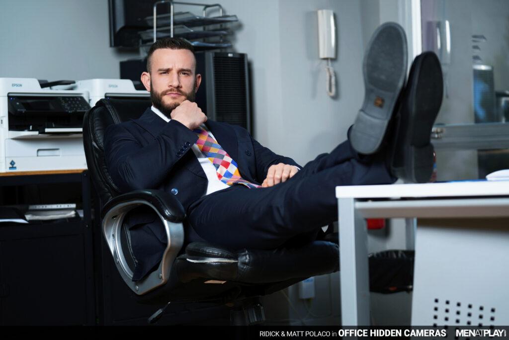 He’s not only making sure they’re working, but also enjoys the various views from his desk when they undoubtedly get horny, and when alone, pull out their cocks for an afternoon stroke. Today, Ridick is in for a real show, compliments of his sexy employee Matt Polaco and his thick, huge, uncut Polish cock and bubble butt!
