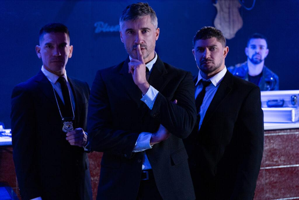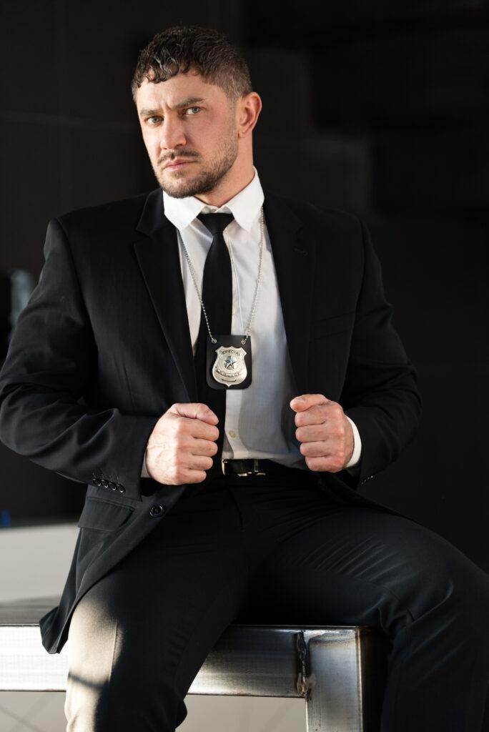 Beleaguered CEO Jay Roberts’s day goes from bad to worse as detectives Dato Foland and Andy Toro arrive at his office and arrest him! The cops zip-tie the CEO to a chair, but Jay’s offer to take both their loads induces them to set him free so he can suck them. The guys tease and finger his hole, spit-roasting him on the conference room table, then form a train. Jay rides Dato as Andy sucks him, then jacks off as he takes two thick loads. But just as he thinks he’s cum out on top, he learns nothing is as it seems…