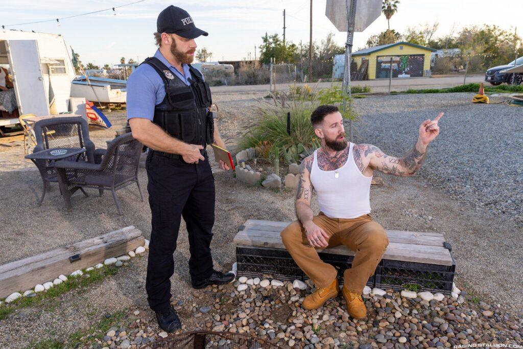 Parole officer Brogan is stopping by the trailer park to check on recently released convict Troy Daniels. It’s not long before the uniformed hunk is throwing Troy on the bed, getting a mouthful of his fat cock, and eating out the criminal’s tasty ass. Now on his back with his legs sprawled open, the muscular officer grunts as he’s barebacked by Troy’s big hairy dick and feeding his load to the trailer trash stud.